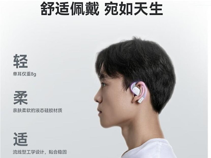 佩戴上这款耳机是真的挺舒服,这款耳机采用创新的140° 三角稳固力学设计,并搭配C 形桥结构,即便处于运动状态,也能稳稳贴合耳部,不易脱落;而且单耳仅重8.9 克,佩戴起来十分轻松舒适,长时间使用也不会有压迫感,能让耳朵始终保持轻松舒适的状态。